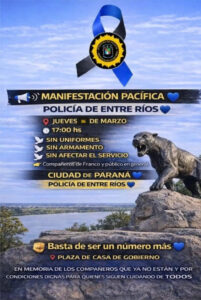 El anuncio se hizo en medio de una tensión a nivel regional por la asonada policial santafesina, que tuvo en vilo durante varios días a la provincia. En ese contexto, policías entrerrianos convocaron a una marcha “sin uniformes, sin armamentos y sin afectar el servicio, con compañeros de franco y público en general” para el 14 de marzo. El panfleto anónimo que circuló invitaba a una protesta “en Memoria de los que ya no están y por condiciones dignas de trabajo para quienes siguen cuidando de todos”.